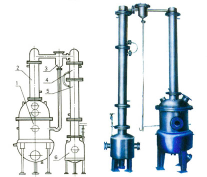 本设备主要包括浓缩罐、第一冷凝器、汽液分离器、第二冷凝器、冷却器、受液桶六个部件组成,全部有不锈钢制造。浓缩罐为夹套结构,冷凝器为列管式,冷却器为蛇管式。